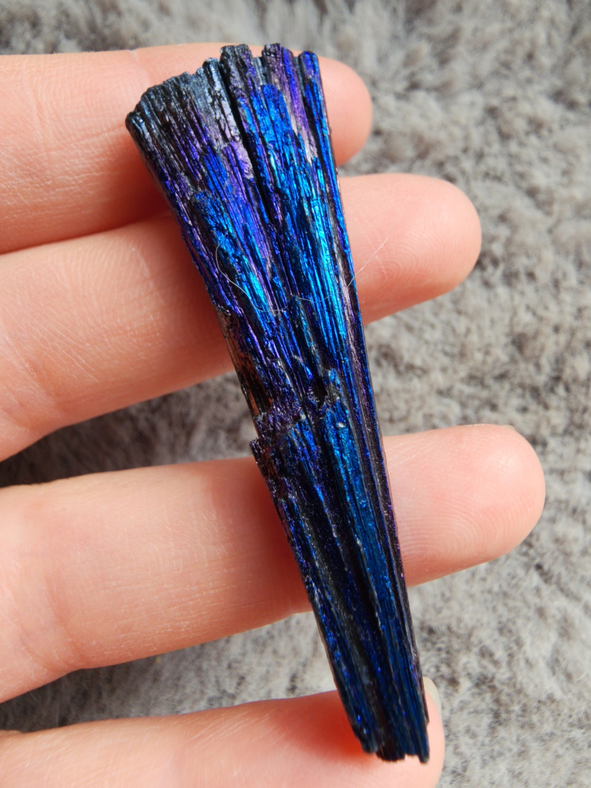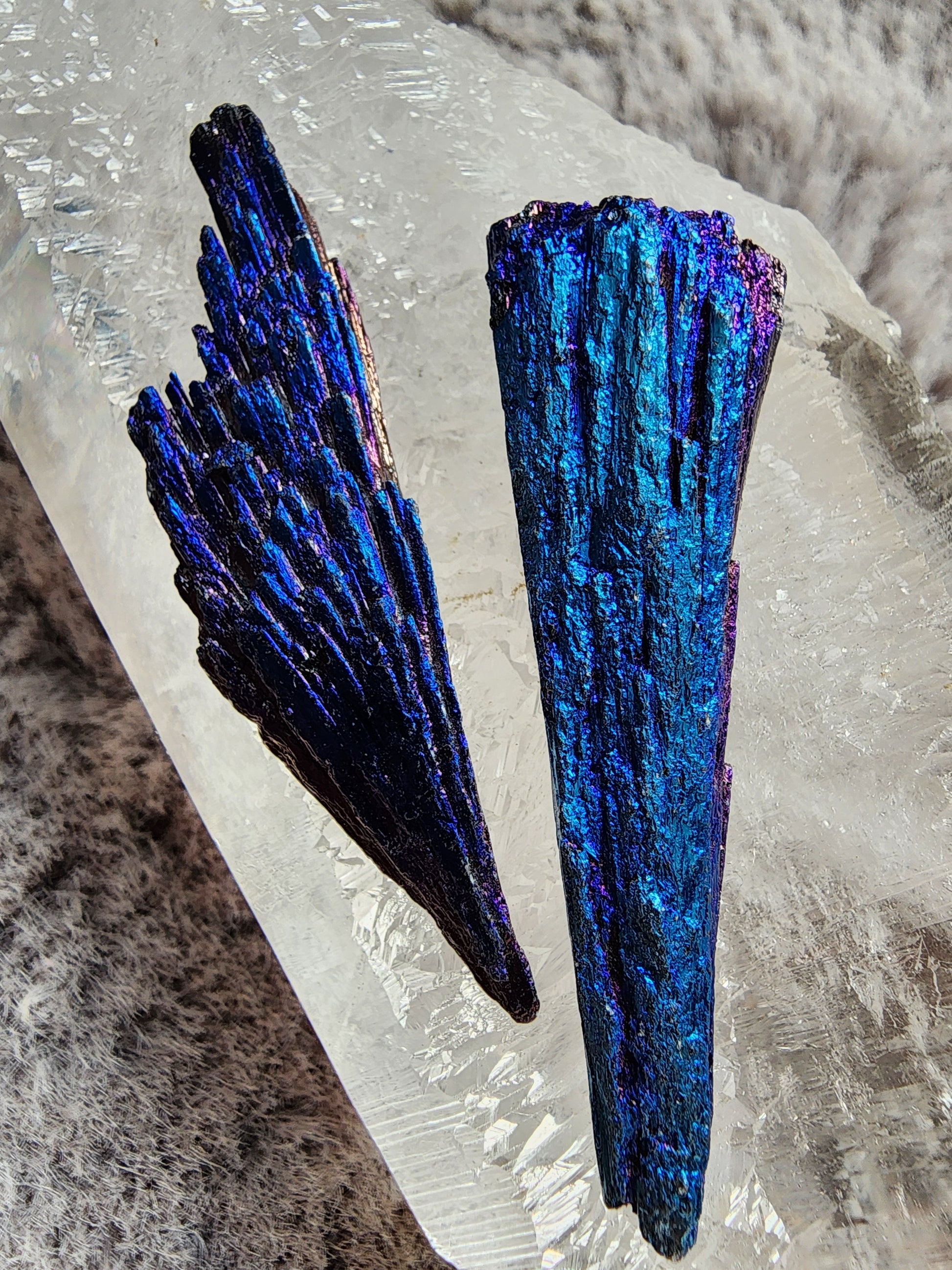 Please note: Originally these Kyanite Crystals grew naturally as Black Kyanite from Brazil but since have been bonded with different metal like titanium to get the "Aura" coating you see - They have been altered and do not form naturally from Mother Gaia with the Aura appearance they have now but have been enhanced.