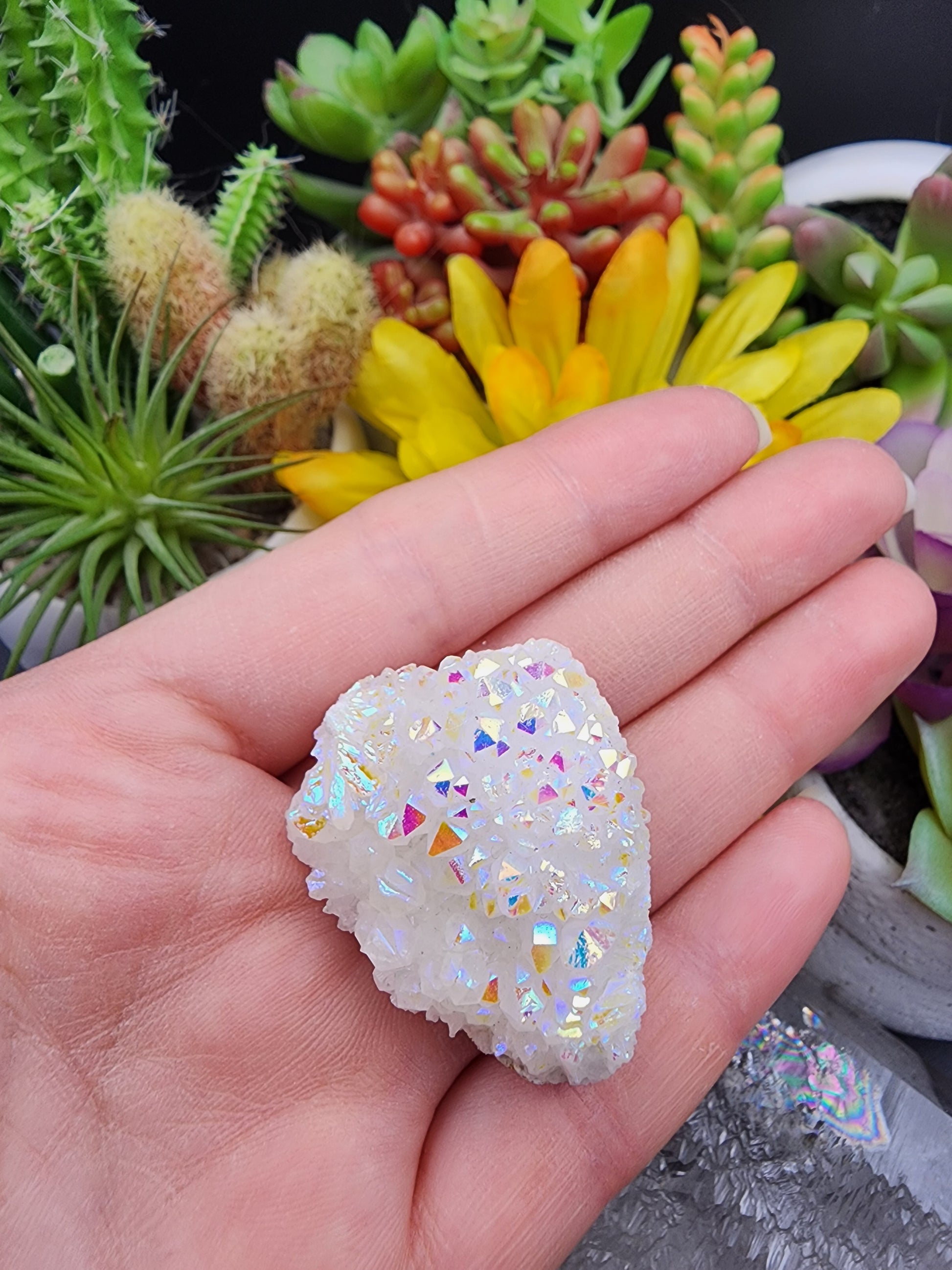 Please note: Originally this specimen grew as a Clear Quartz cluster from Brazil but since has been bonded with different metal like titanium and platinum to get the "Aura" coating you see - It has been altered and did not form naturally from Mother Gaia with the Aura appearance it has now but has been enhanced.