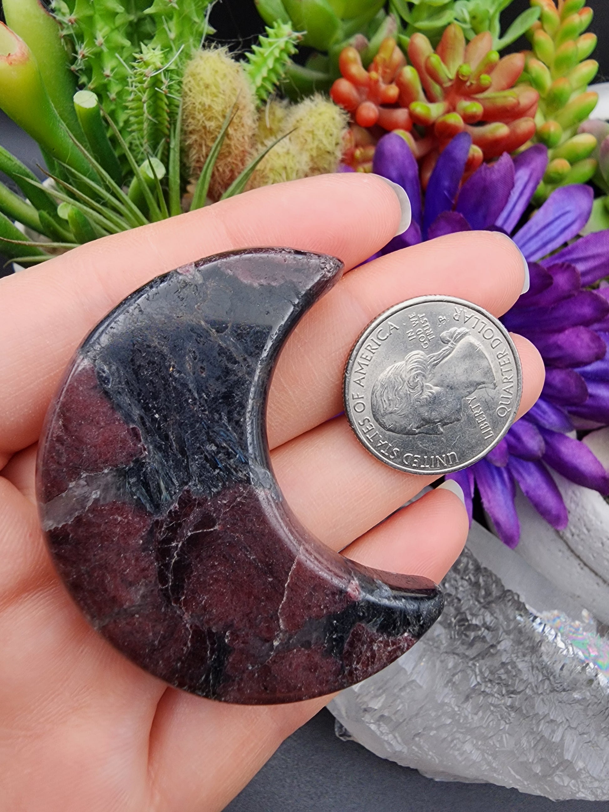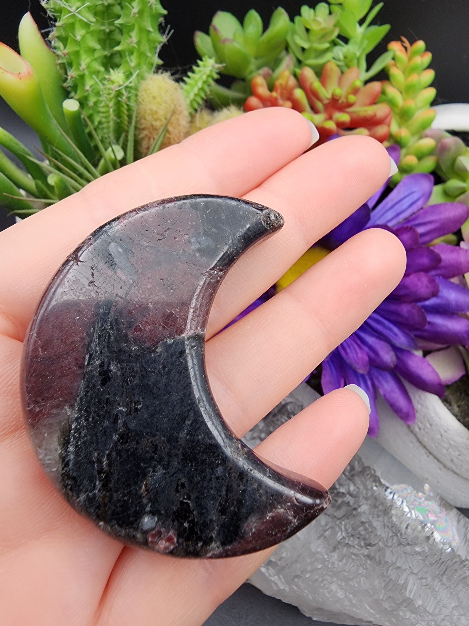 Beautiful Garnet included Arfvedsonite Crescent Moon Carving
