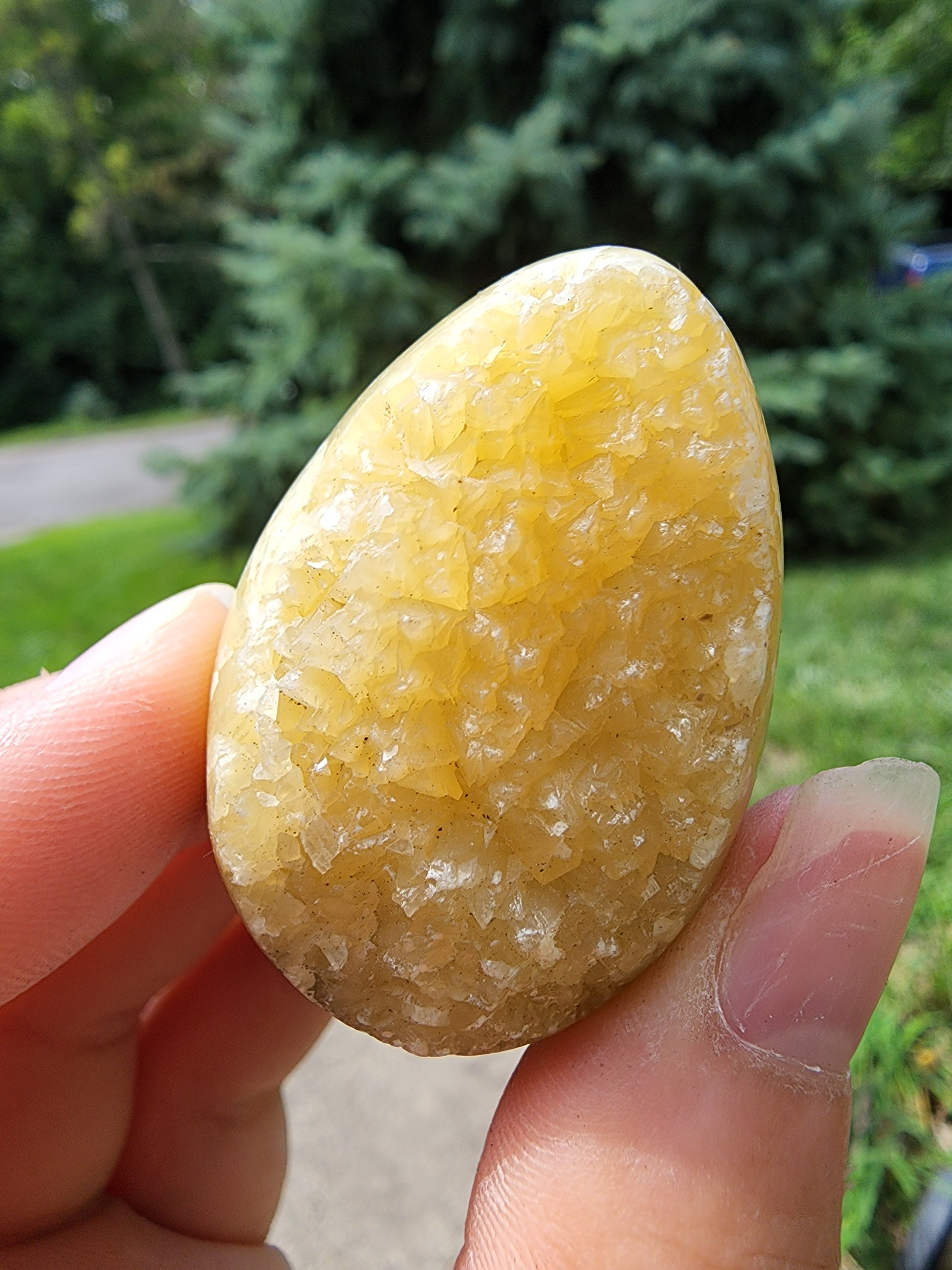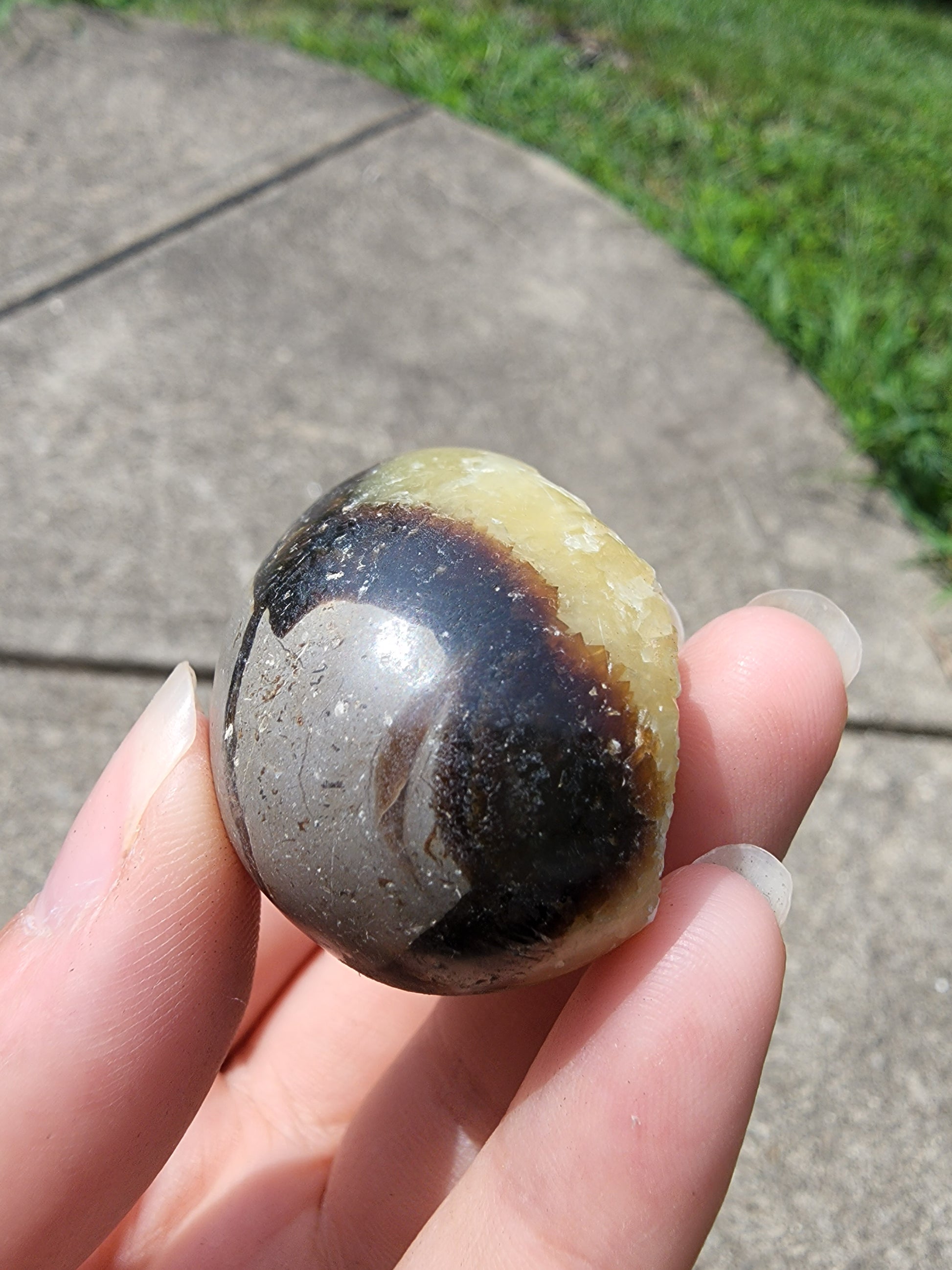 This Septarian specimen has been left rough on the front and has been polished and shaped around the edges to be a beautiful egg shape